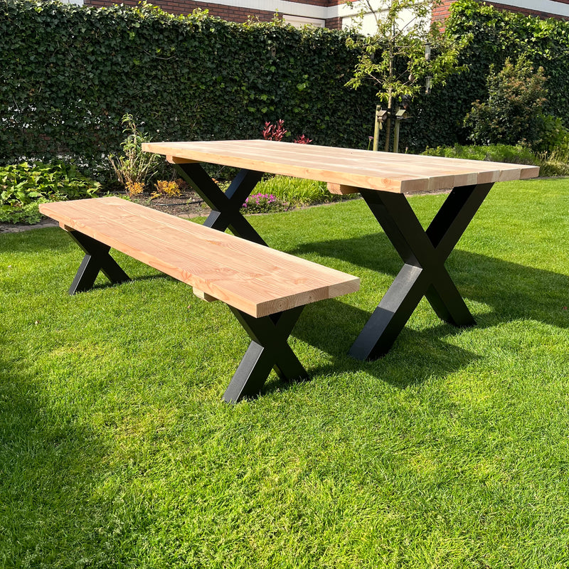 Alle gegevens bekijkenTuintafel Rusto is met de combinatie van het douglashouten blad en stalen poten een echte eye-catcher. Het dikke houten blad en de stalen X-poten g...