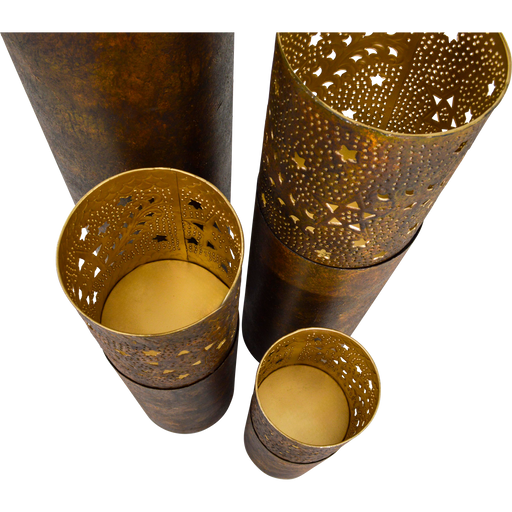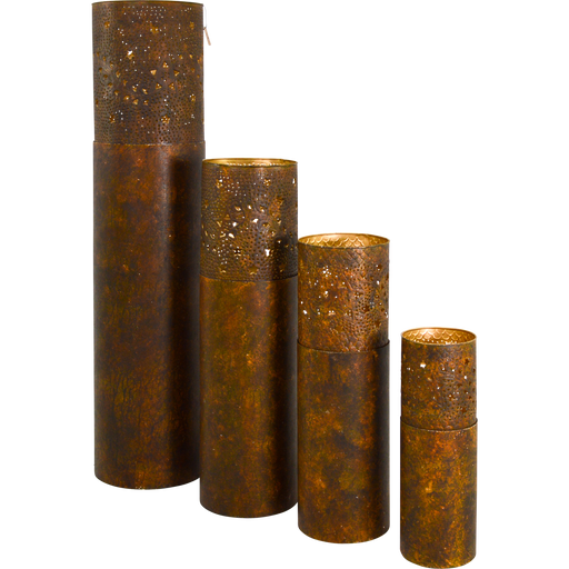 S: Ø18x50cm | M: Ø22x70cm | L: Ø25x88cm | XL: Ø30x131cm | Steel | Rust antique finish, gold inside