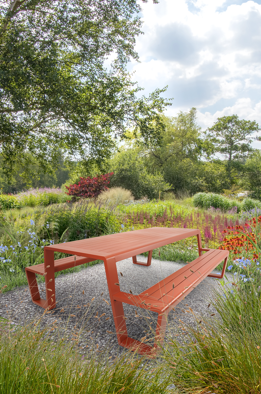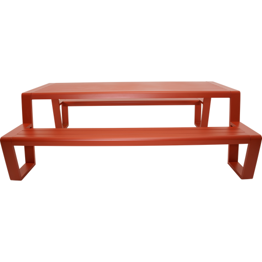 220x183x74cm | Table 220x87x74cm | Bench 220x29x44cm | Aluminium matt soft red frame and table top