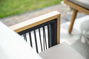 Het sterke aluminium frame is licht van gewicht, onderhoudsvrij en bestand tegen verschillende weersomstandigheden. De armleuningen zijn afgewerkt met hoogwaardig rope dat volledig is doorgekleurd om verkleuring te minimaliseren. De comfortabele taupekleurige kussens zijn voorzien van een waterafstotende coating, waardoor gemorste vloeistoffen eenvoudig af te nemen zijn. Dankzij de ritsen kunnen de hoezen met de hand worden gewassen, zodat de set er langdurig verzorgd uit blijft zien.