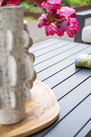 Alle elementen van de set zijn opgebouwd uit een hoogwaardig aluminium frame in een zwarte kleur, afgewerkt met een duurzame poedercoating. Dit maakt de set licht van gewicht, sterk, roestvrij en geschikt voor langdurig buitengebruik. De strakke lijnen en brede armleuningen geven de set een moderne en tijdloze uitstraling die past binnen uiteenlopende tuinstijlen.