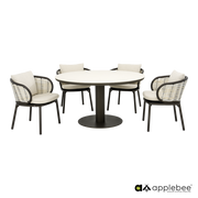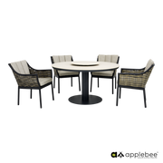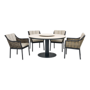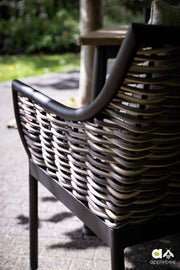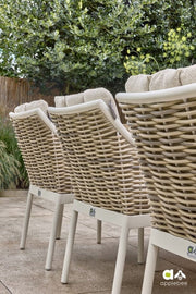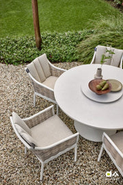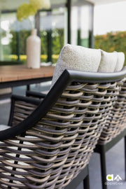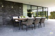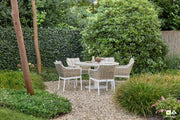 De Milou dining tuinstoel matcht met een teakhouten dining tuintafel zoals Milou en Martinique of met een aluminium dining tuintafel zoals Melville en Zanzibar.