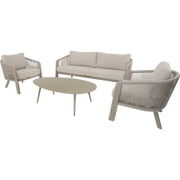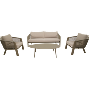 De Loungeset Tanoa is een complete buitenset die stijlvol comfort combineert met praktische functionaliteit voor elk terras, balkon of tuin. Met een matte taupe afwerking en een eigentijdse taupe rope-motief wicker geeft deze set een rustige, uitnodigende uitstraling.