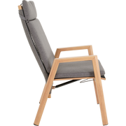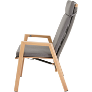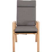 Het aluminium frame biedt stabiliteit zonder zwaar aan te voelen, terwijl de woodlook afwerking een warme, natuurlijke uitstraling geeft die bij diverse tuinstijlen past. De combination van two-part textilene zitting en olefin kussens levert een ademende, comfortabele zitervaring die bestand is tegen weersinvloeden en kleurbestendig blijft. Dankzij het sneldrogende kussenmateriaal is opfrissen na een regenbui snel gedaan, zodat je sneller weer buiten kunt genieten.