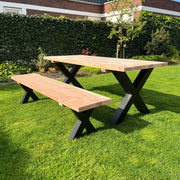 La table de jardin Rusto attire tous les regards grâce à la combinaison du plateau en bois Douglas et des pieds en acier. Le plateau en bois épais et les pieds en X en acier confèrent non seulement à la table un aspect très robuste, mais la rendent également très robuste.